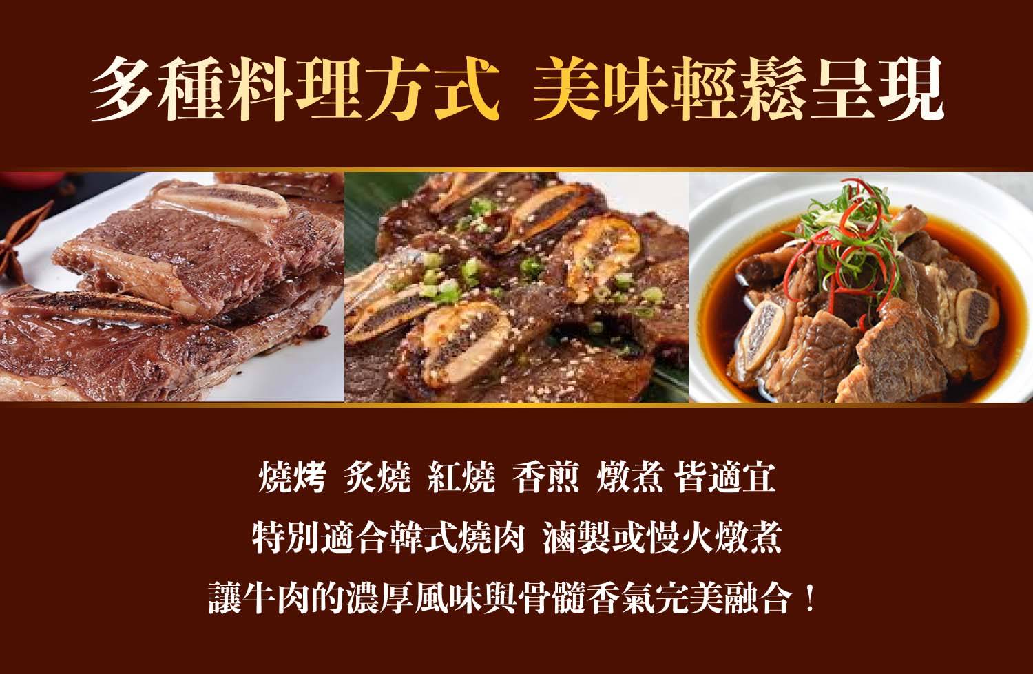 燒烤、炙燒、紅燒、香煎、燉煮 皆適宜,特別適合韓式燒肉、滷製或慢火燉煮,讓 牛肉的濃厚風味與骨髓香氣完美融合!